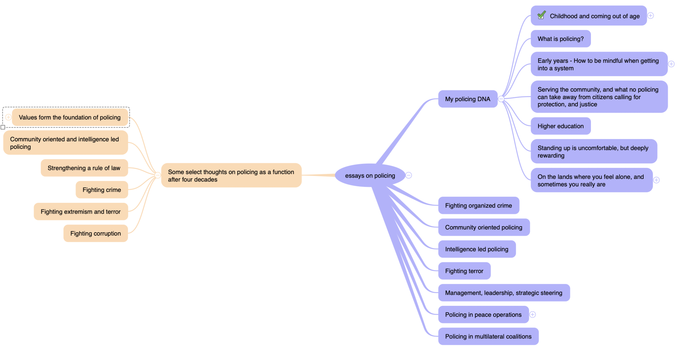 What you see above is an early attempt to structure my thoughts on policing using a mindmap. Behind some of these branches there are deeper levels which I have hidden here. By no means this early mindmap is complete, I am using it here as a conduit for a conclusion which came up when I attempted to cluster topical areas which could possibly be of relevance for these essays. At the end of this thought process I was left with one organising principle around which I could arrange a number of aspects showing up in this mindmap: What is integrity?
