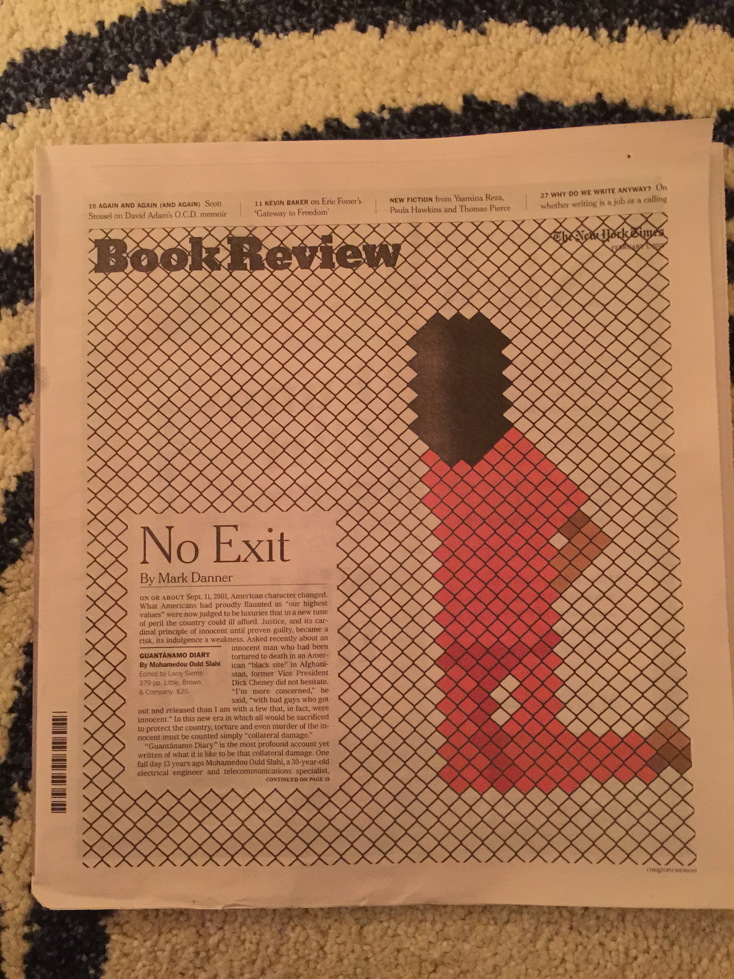 On the other hand, the open page of the NYT that I found this morning, it is about a book review: “Guantanamo Diary“, by Mohamedou Ould Slahi. Mark Danner reviews the book for NYT, starting with the following: “On or about Sept. 11, 2001, American character changed. What Americans had proudly flaunted as “our highest values” were now judged to be luxuries that in a new time of peril for the country could ill afford.”